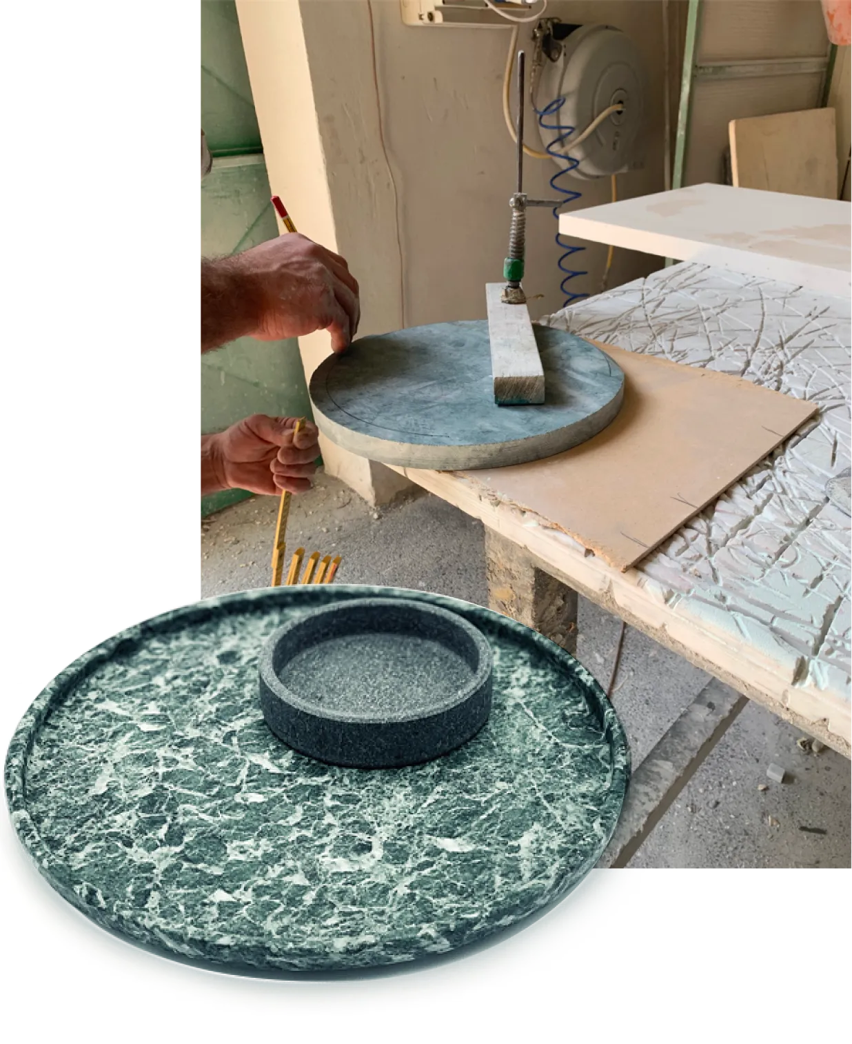 La linea Collection, realizzata in collaborazione con Kaleidostone, artigiani del marmo, nasce dall'idea di voler recuperare tutte le parti delle lastre di marmo naturale, dalle pietre più usate ai materiali più preziosi, dando nuova vita a tutto ciò che altrimenti andrebbe perduto.